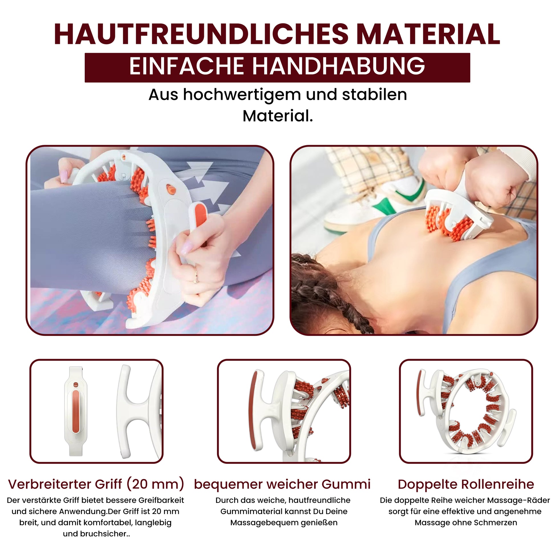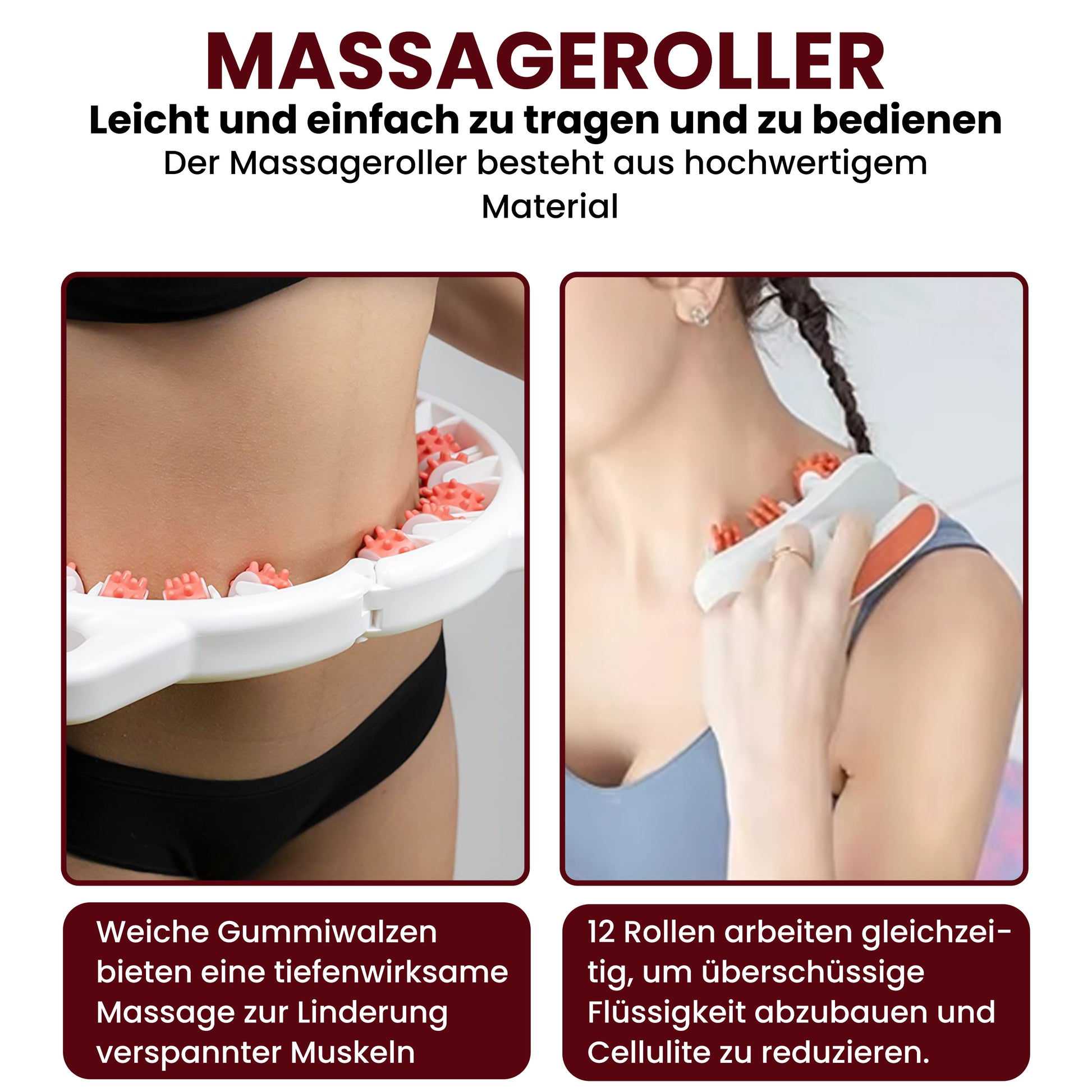 Der Tone & Tame ist eine manuelle Massagerolle zur gezielten Massage von Beinen, Armen, Bauch und anderen Körperpartien. Durch gleichmäßige Rollbewegungen wird die Durchblutung angeregt, die Muskulatur gelockert und das Hautbild bei regelmäßiger Anwendung sichtbar geglättet. Ideal zur Unterstützung der täglichen Körperpflege und Entspannungsroutine.